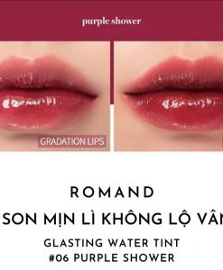 Những ai đang than trời vì môi khô bong tróc thì hãy thử nghiệm ngay son Romand tint 06 Purple Shower, đảm bảo sẽ không thấy thất vọng một chút nào. Son môi có nhiều loại, không phải son lì mới là lựa chọn duy nhất để tôn vinh nét đẹp bờ môi và gương mặt. Nhất là những ai có bờ môi khô, muốn đẹp chuẩn trend hiện nay thì hãy cân nhắc son tint. Ứng của viên sáng giá của son tint bóng hiện nay phải kể về dòng son Romand Glasting Water Tint. Một phiên bản cấp ẩm hiệu quả, có độ bóng bẩy nhất định, hô biến gương mặt trở nên giàu sức sống hơn hẳn. Son Romand 06 Purple Shower đích thị là lựa chọn bạn không nên bỏ qua trong BST này.